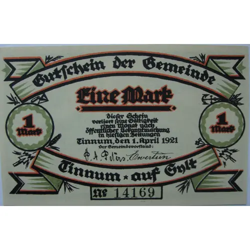 | Obverse lettering | Gutschein der gemeinde Tinnum auf Sylt.Eine mark.Signatures. |