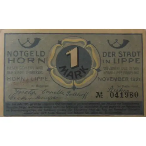 1 Mark NOTGELD DER STADT HORN IN LIPPE DIESER SCHEIN WIRD BIS ZUM 31. DEZ. 21 VON DER STÄDT. SPARKASSE HORN i. LIPPE EINGELÖST HORN i. LIPPE NOVEMBER 1921 Der Magistrat Der Stadtv.-Vorstand Um das Jahr 1385 geriet der Lippische Graf Bernard in die Gefangenschaft des Herzogs von Braunschweig. Hornsche Bürger beschlossen dessen heimliche Befreiung, zur nächtlichen Stunde zogen sie zur Kahlenburg im Braunschweigischen, die Befreiung glückte. Zur Erinnerung trägt das Rott der Hornschen Schlachtschwertierer noch heute Rüstung und Schwert bei passenden Gelegenheiten. (Translation: 1 Mark NOTGELD OF THE CITY OF HORN IN LIPPE THIS BILL IS REDEEMED UNTIL DECEMBER 21 FROM THE CITY SAVINGSBANK HORN i. LIPPE HORN i. LIPPE NOVEMBER 1921 The Magistrate The City Council Around 1385, count Bernard from Lippe was taken prisoner by the Duke of Brunswick. Horn`s citizens decided to liberate him in secret, and at night they moved to the castle Kahlenburg in the state of Brunswick, and the liberation was successful. As a reminder, the flock of Horn`s sword swingers still carries armor and swords on appropriate occasions.) |