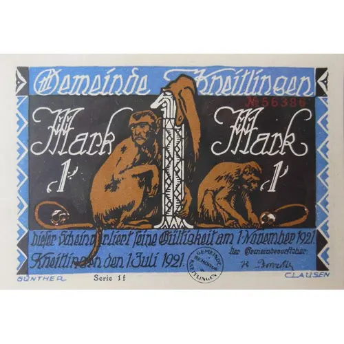Gemeinde Kneitlingen dieser Schein verliert seine Gültigkeit am 1/November 1921 Kneitlingen den 1. Juli 1921 (Translation: Local community of Kneitlingen This certificate expires on November 1, 1921 Kneitlingen July 1, 1921) |