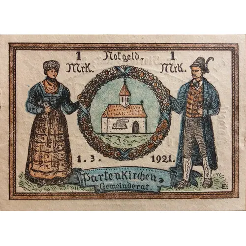 | Obverse lettering | Notgeld 1 Mrk. 1 Mrk. 1.3.1921 Partenkirchen Gemeinderat. |