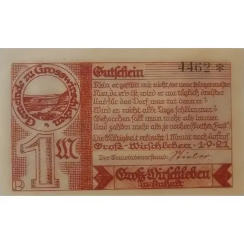 Gemeinde zu Grosswirschleben Gutschein Nein, er gefällt mir nicht, der neue Bürgermeister Nun, da er`s ist, wird er nur täglich dreister. Und für das Dorf, was tut denn er? Wird es nicht alle Tage schlimmer? Gehorchen soll man mehr als immer. Und zahlen mehr als je vorher (Goethe`s `Faust`) Die Gültigkeit erlischt 1 Monat nach Aufruf. Groß-Wirschleben 1. 9. 21 Der Gemeindevorstand Groß-Wirschleben in Anhalt (Translation: Community of Grosswirschleben Voucher No, I don`t like him, the new mayor Now that he is, he only gets brazen every day. And for the village, what does he do? Isn`t it getting worse every day? You should obey more than ever. And pay more than ever before (`Faust` from Goethe) The validity expires 1 month after the call. Groß-Wirschleben September 1st, 1921 The municipal board Groß-Wirschleben in Anhalt) |