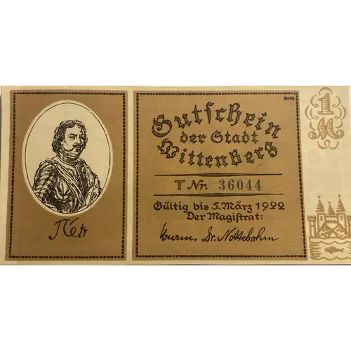 Obverse lettering GUTSCHEIN DER STADT WITTENBERG T 1M Gültig bis 5.März 1922 Der Magistrat: