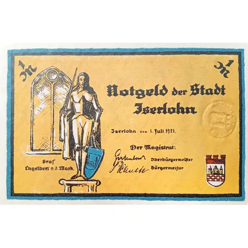 Obverse lettering 1 M(2) NOTGELD DER STADT ISERLOHN Iserlohn den 1.Juli 1921 Der Magistrat Oberbürgemeister Bürgemeister Graf Engelbert v.d.Mark
