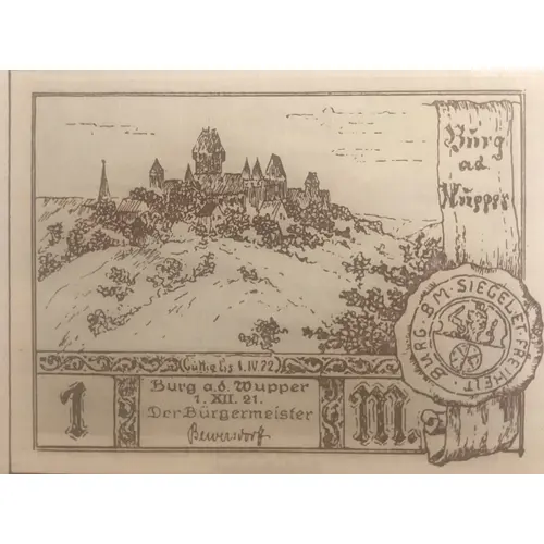 | Obverse lettering | Burg a.d.Wüpper BURG B.M.SIEGEL ET FREIHEIT Burg a.d.Wüpper 1.XII.1921 Der Bürgermeister 1 M |