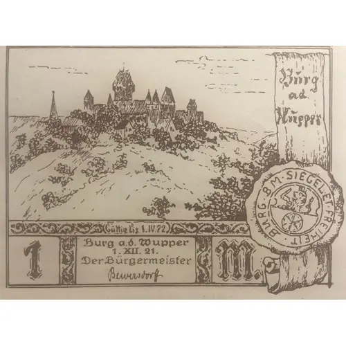 | 正面铭文 | Burg a.d.Wüpper BURG B.M.SIEGEL ET FREIHEIT Burg a.d.Wüpper 1.XII.1921 Der Bürgermeister 1 M |