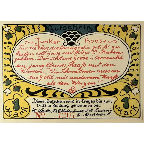 | Obverse lettering | Gutschein ~ Junker hoose ~ Tür die Ehre, die Landgräfin geküsst zu haben soll hoose eine Metze Dukaten zahlen. Der sehlaue hoose überreicht ein gang Kleines Maass mit den Worten: „Wir Schwä Erner messen das gold mit anderem Waass als den Weizen!“ Dieser Gutschein wird in Treysa bis zum 1.4.22 in Zahlung genommen bei: 1 Mark |
