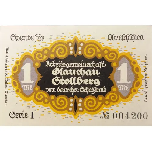 | Obverse lettering | Spende für Oberschlesien 1 Mk Arbeitsgemeinschaft Glauchau Stollberg vom deutscher Schutzbund 1 Mk Serie I No. 004200 Rats-Drückerei R. Dulce, Glauchau. Gesetzl. geschützt No. 56,226. |