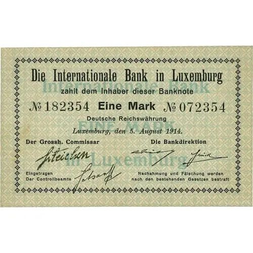 | Obverse lettering | Die Internationale Bank In Luxemburg zahlt dem Inhaber dieser Banknote EINE MARK Deutsche Reichswäehrung Luxemburg, den 5. August 1914. Nachahmung und Fälschung werden nach den bestehenden Gesetzen bestraft. (Translation: International Bank of Luxembourg Pays to the owner of this banknote One Mark German Empire Currency Luxembourg, August 5, 1914. Imitation and counterfeiting will follow punished under existing laws.) |