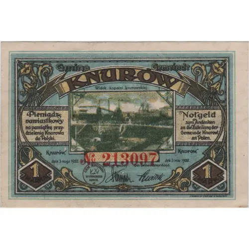 | Obverse description | Pieniądz namiastkowy na pamiątkę przydzielenia Knurowa do Polski. Widok kopalni knurowskiej. |
