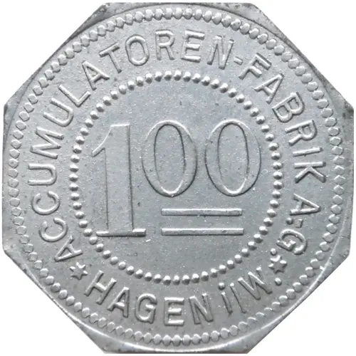 | Obverse lettering | ACCUMULATOREN-FABRIK A.G. 1°° * HAGEN i.W. * |