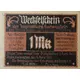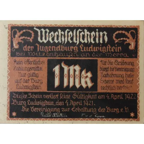 Wechselschein der Jugendburg Ludwigstein bei Witzenhausen an der Werra. Kein öffentliches Zahlungsmittel. Nur gültig auf der Burg Ludwigstein. 2 Mark Für die Einlösung bürgt die Vereinigung. Nachahmung dieser Scheine wird strafrechtlich verfolgt. Dieser Schein verliert seine Gültigkeit am 4. April 1922 Burg Ludwigstein, den 4. April 1921. Die Vereinigung zur Erhaltung der Burg e.V. (Translation: Exchange note of the Youth Castle Ludwigstein near Witzenhausen at the Werra. No public money. Only valid at Ludwigstein Castle. 2 marks The association vouches for redemption. Imitation of these notes will be prosecuted. This certificate expires on April 4, 1922 Ludwigstein Castle, April 4, 1921 The Association for the Conservation of the Castle e.V.) |
