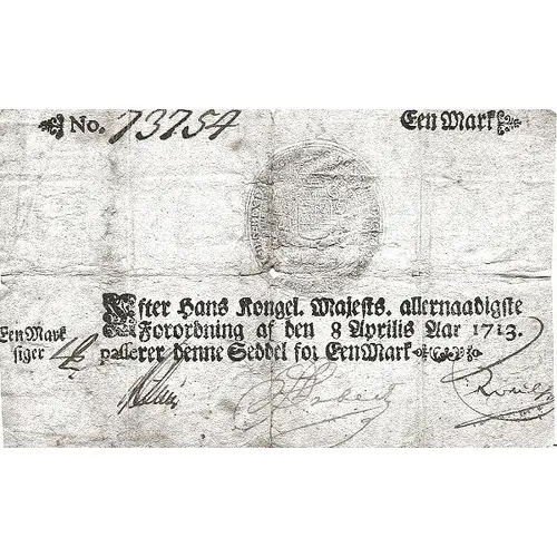 (Translation: After his Royal Majesty`s most gracious regulation of 8 April 1713. Pass this note for 1 Mark.) |