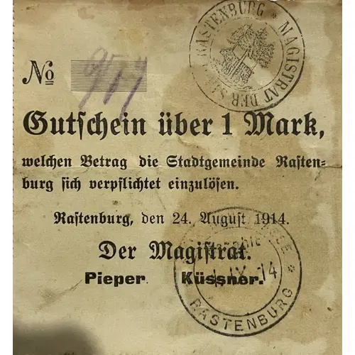 (Translation: Voucher for 1 mark, which the municipality of Rastenburg commits to redeem. Rastenburg, August 24, 1914. The Magistrate.) |