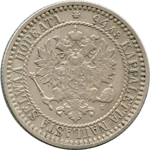 Artistry: The design of this 1 Markka coin is generally attributed to August Fredrik Soldan, the chief engraver at the Mint of Finland. Stylistically, it reflects the Neoclassical aesthetic common in mid-19th century European coinage, characterized by clarity and formal balance. The obverse features the crowned Imperial Russian double-headed eagle, emblematic of Finland's Grand Duchy status, bearing the Finnish lion shield. The reverse displays the large denomination "1 MARKKA" encircled by a wreath, emphasizing national currency.