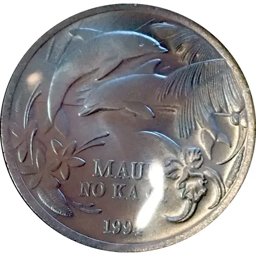 | Reverse lettering | ONE MAUI TRADE DOLLAR 1 ONE GOOD FOR ONE DOLLAR IN TRADE AT PARTICIPATING MERCHANTS DURING 1993 THE VALLEY ISLE |