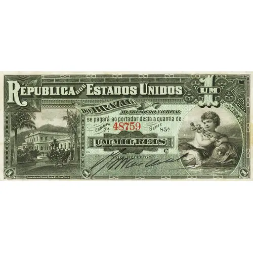 | Obverse lettering | Republica dos Estados Unidos do Brazil 1 UM NO THESOURO NACIONAL se pagará ao portador desta a quantia de UM MIL REIS VALOR RECEBIDO 1 American Bank Note Co, New York 1 (Translation: Republic of the United States of Brazil 1 One In the National Treasure The holder will be paid the amount of ONETHOUSAND REIS Received Value 1 American Bank Note Co, New York 1) |