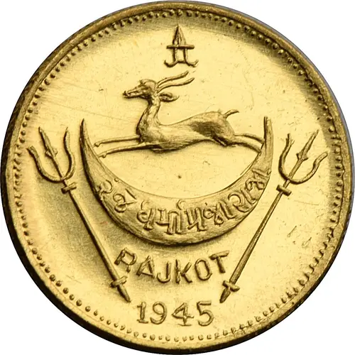 | نوشتههای روی توکن | રંજે ધર્મી પ્રજા રાજા RAJKOT 1945 (Translation: Duty of the king is to serve his people) |