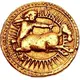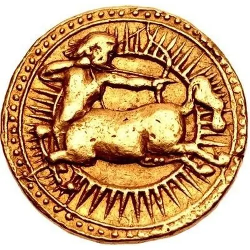 | 表面の説明 | Centaur, head and upper torso right, galloping left, preparing to fire arrow from bow; radiate sun behind |