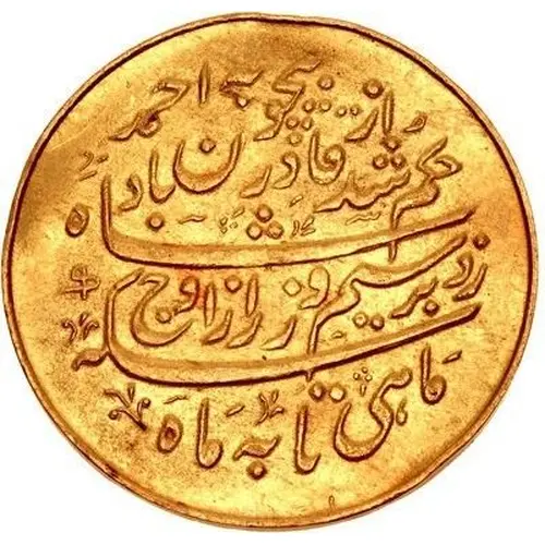 hukm shod az qadir-i-bechun ba-Ahmad badshah sikka zan bar sim-o-zar az auj-i-mahi ta ba-mah (Translation: Command came from God, the inscrutable, to Ahmad the King strike coin on silver and gold from the top of fish (depths of the sea) to the moon) |