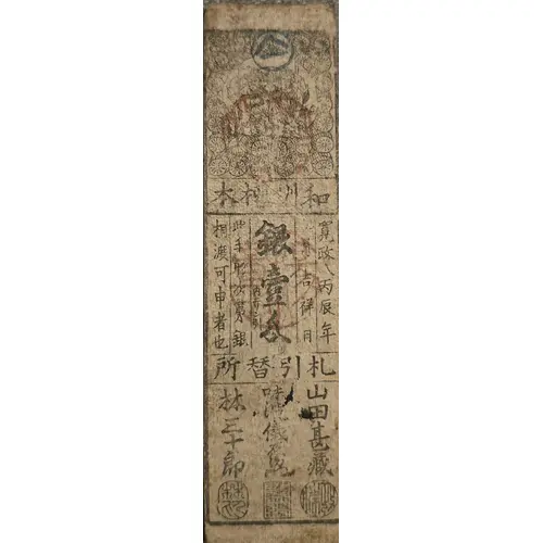 本柳州和 寛政八丙辰年 五月吉祥日 銀 壹 匁 此手形次第銀 相渡可申者也 所 替 引 札 山田甚蔵() 味波儀右衛門[] 林三十郎(林) (Translation: Washū (Yamato Province) Yanagimoto. Kansei eighth year [of the] Fire Dragon, Fifth month auspicious day. Silver One Monme. This ticket can be exchange to silver on demand. Bill Exchange office.) |