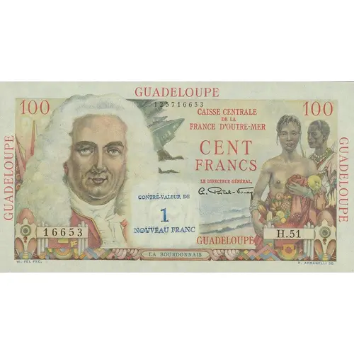 Obverse lettering GUADELOUPE CAISSE CENTRALE DE LA FRANCE D`OUTRE-MER CENT FRANCS CONTRE-VALEUR DE 1 NOUVEAU FRANC GUADELOUPE LA BOURDONNAIS W. FEL. FEC. R. ARMANELLI SC.