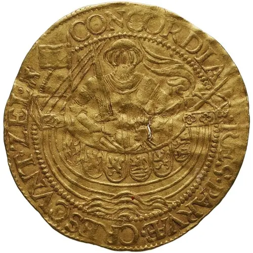 | Obverse description | Armored knight in ship facing, holding sword in right hand; six provincial coats of arms on stern. |