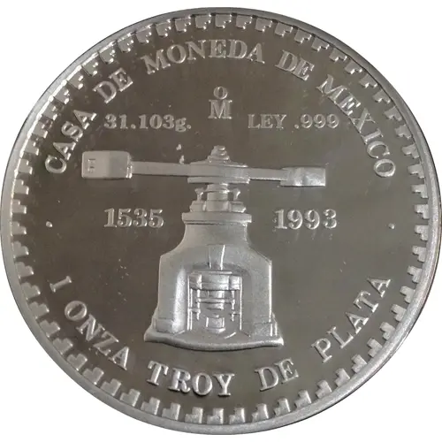 | Mint | and Fineness. Mexico City Mint opening year, and date. Script: Latin Lettering: CASA DE MONEDA DE MEXICO 31.103g Mo LEY .999 1535 1993 1 ONZA TROY DE PLATA Translation: Mexico City Mint 31.103g Mexico City .999 1535 1993 1 Silver ounce Reverse `Piedra de |