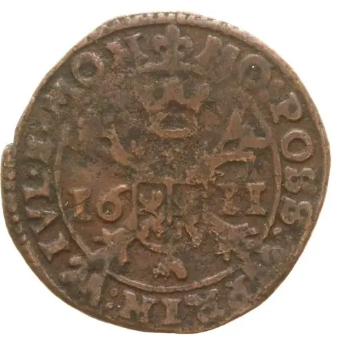 | 表面の説明 | Burgundian cross with crowned arms of Gelderland-Julich in center divides date. |