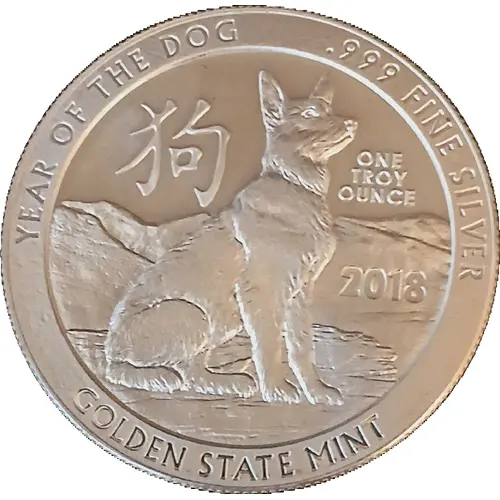 | Obverse lettering | YEAR OF THE DOG 狗 ONE TROY OUNCE 2018 GOLDEN STATE MINT |