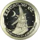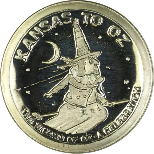 A witch is riding a flying broom in the center with a crescent moon at the top left and stars all across the background. The title of the coin series is featured along the top with the name of the event being commemorated stated at the bottom. |
