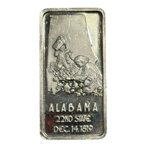 | Reverse lettering | ALABAMA TWENTY - SECOND STATE CAPITAL - MONTGOMERY ONE TROY OZ. .999 FS. HM75P |