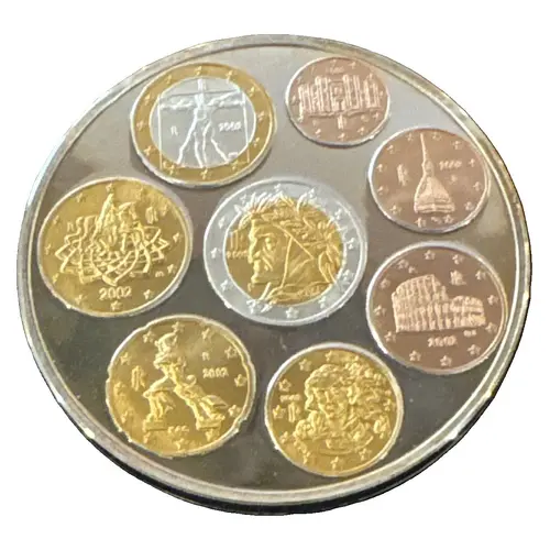 | Obverse description | Depiction of the first 8 euro coins from Italy. |