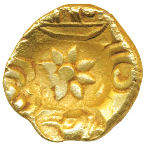 | Obverse description | 5 punches - central punch of a lotus flowe (`padma`) with 8 petals, 2 punches of Kannada letter ’Shri’, 1 punch of Shankha or Conch shell, and 1 punch of Devnagari legend ’Kanhadeva’ with a bow below |