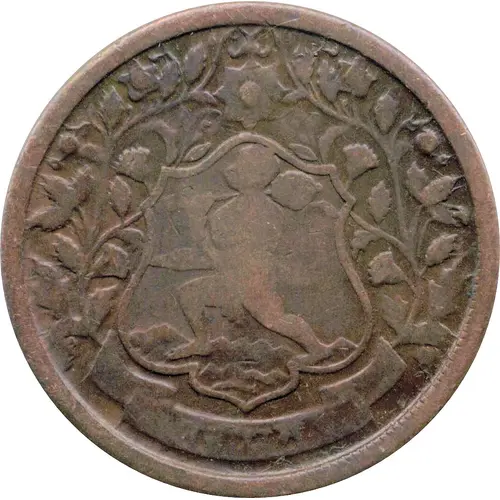 | Obverse description | Star on top of central shield containing Hanuman (the Hindu monkey God) walking left, holding a club in right hand, and an object in left hand. Flowers and plants outside shield. Three-fold ribbon at bottom, with lettering in central part. Beaded border |