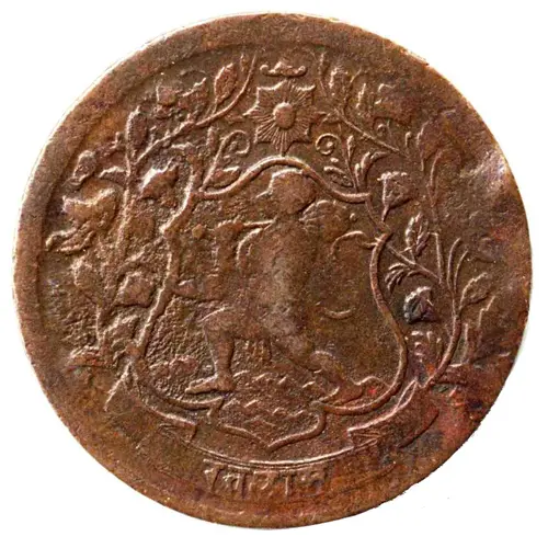 | Reverse description | Central beaded circle contains lettering,`Ek paisa (one paisa), San (year)and 1947` in Nagri. Year is in Vikram Samvat. Flowers and plants around outside of circle. Flat Border. |