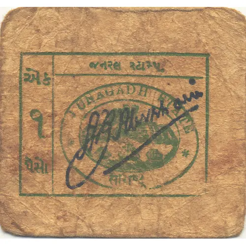 | Obverse description | No date, circa 1943, green, oval seal stamp saying `JUNAGADH STATE` |