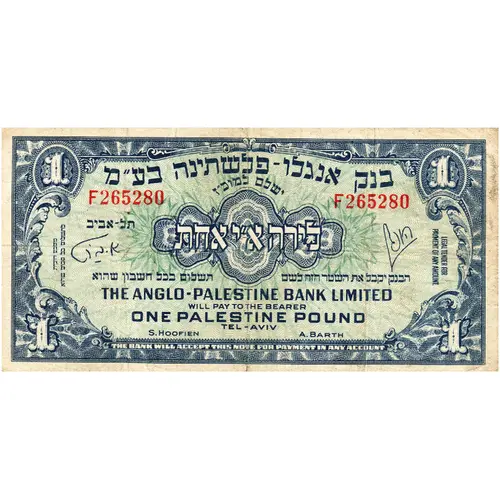 1 בנק אנגלו-פלשתינה בע`מ תל-אביב ישלם למוכ`ז לירה א`י אחת הבנק יקבל השטר הזה לשלם תשלום בכל חשבון שהוא THE ANGLO-PALESTINE BANK LIMITED WILL PAY TO THE BEARER ONE PALESTINE POUND TEL-AVIV LEGAL TENDER FOR PAYMENT OF ANY AMOUNT מטבע חוקית לתשלום כל סכום שהוא THE BANK WILL ACCEPT THIS NOTE FOR PAYMENT IN ANY ACCOUNT |