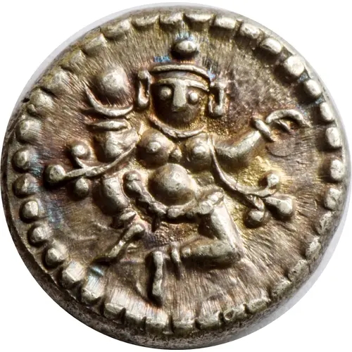 | Obverse description | Dancing figure of Bal Krishna with a butter ball in his hand (wrongly described by KM catalog as dancing Chamundi), all within a circle of beads |