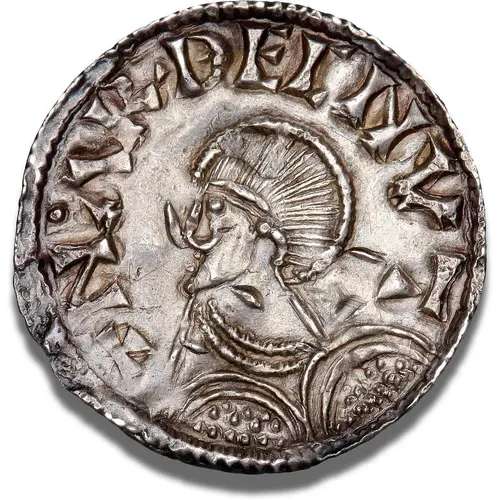 Artistry: The design strongly reflects the dominant Anglo-Saxon numismatic tradition. Specific engravers remain anonymous; the stylistic school is clearly derivative of English prototypes. The obverse features a crude, often diademed or helmeted, bust of the king. The reverse showcases the distinctive "Cross and Crescents" type (Hauberg 21): a short cross with crescentic ornaments in the angles, adapted from English designs, surrounded by often blundered legends.
