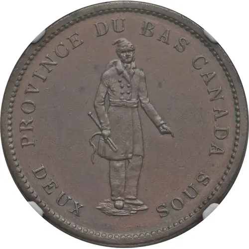 Obverse lettering PROVINCE DU BAS CANADA DEUX SOUS