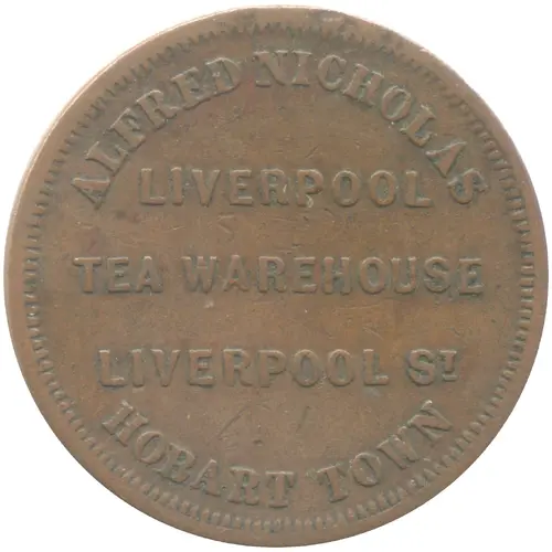 | Obverse lettering | ALFRED NICHOLAS LIVERPOOL TEA WAREHOUSE LIVERPOOL ST HOBART TOWN |