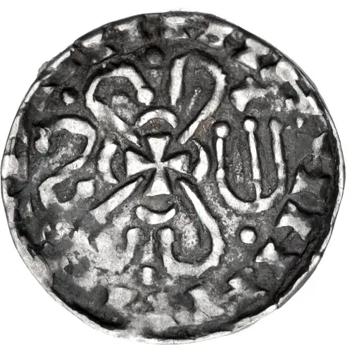 | Reverse description | Long voided cross with pellet at center, and in quadrants pellet, hand, pellet, annulet. Degenerate legend. |