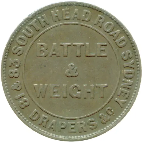 | Obverse lettering | 81 & 83 SOUTH HEAD ROAD SYDNEY DRAPERS & C. BATTLE & WEIGHT |