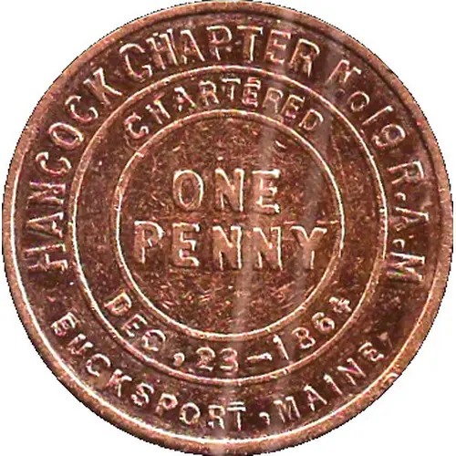 | Obverse lettering | ONE PENNY CHARTERED DEC 23 1864 HANCOCK CHAPTER N°19 RAM BUCKSPORT MAINE |
