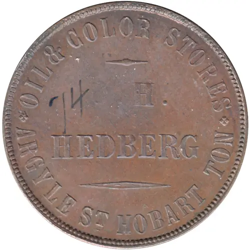 | Obverse lettering | OIL AND COLOUR STORES . ARGYLE ST HOBART TON. - O. H. HEDBERG - |