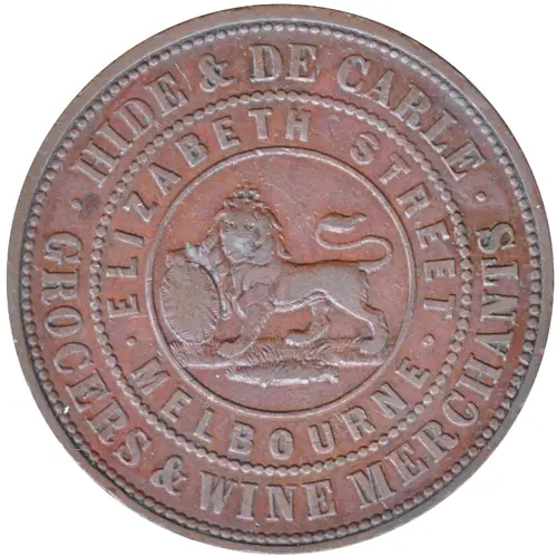 | Obverse lettering | HIDE & DE CARLE ELIZABETH STREET · MELBOURNE · . GROCERS & WINE MERCHANTS . |