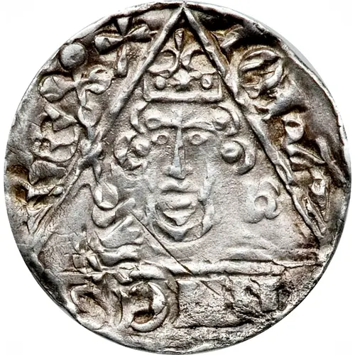 | Obverse description | Crowned facing bust, holding cruciform scepter; rosette to right; all within triangle, legend around |