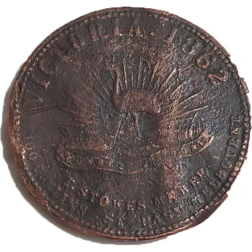 | Obverse lettering | VICTORIA 1862 ADVANCE VICTORIA T. STOKES MAKER 100 COLLINS ST EAST MELBOURNE |