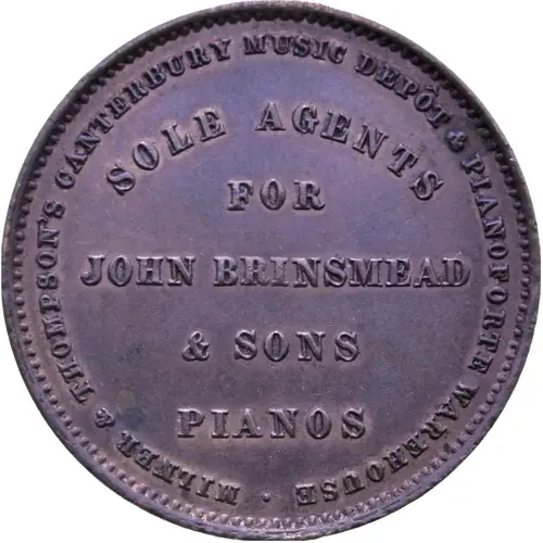 | Obverse lettering | MILNER & THOMPSON`S CANTERBURY MUSIC DEPÔT & PIANOFORTE WAREHOUSE SOLE AGENTS FOR JOHN BRINSMEAD & SONS PIANOS |