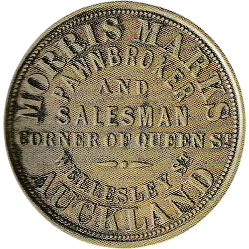 | Obverse lettering | MORRIS MARKS PAWNBROKERS AND SALESMAN CORNER OF QUEEN STREET WELLESLEY STREET AUCKLAND |